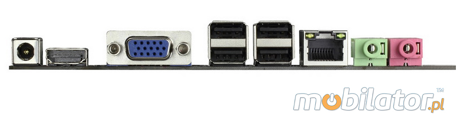 Integrated card - Intel 1000M Lan RTL8111E (optional WiFi module) allow connection to the network. The computer is equipped with: one LAN port, one COM ports (RS232), one VGA output, six USB 2.0 ports, one way audio, one microphone input and connectors built into the motherboard: four USB 2.0 ports, two PowerOUT outputs, one audio output, one CPUFAN, one LVDS connector.
