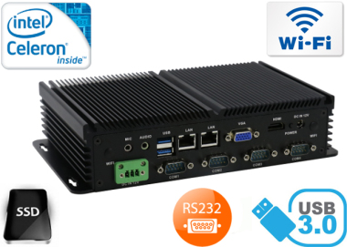 Integrated cards - Intel WGI211AT 1000M Lan and WiFi module allows connection to the network. The computer is equipped with: two LAN ports, one VGA port, six COM ports, one HDMI port, one GPIO interface one USB 3.0 ports, five USB 2.0 ports, SIM Card slot and a built-in connector on the motherboard: two SATA ports, one MiniSATA port, and two Mini-PCIE connectors.