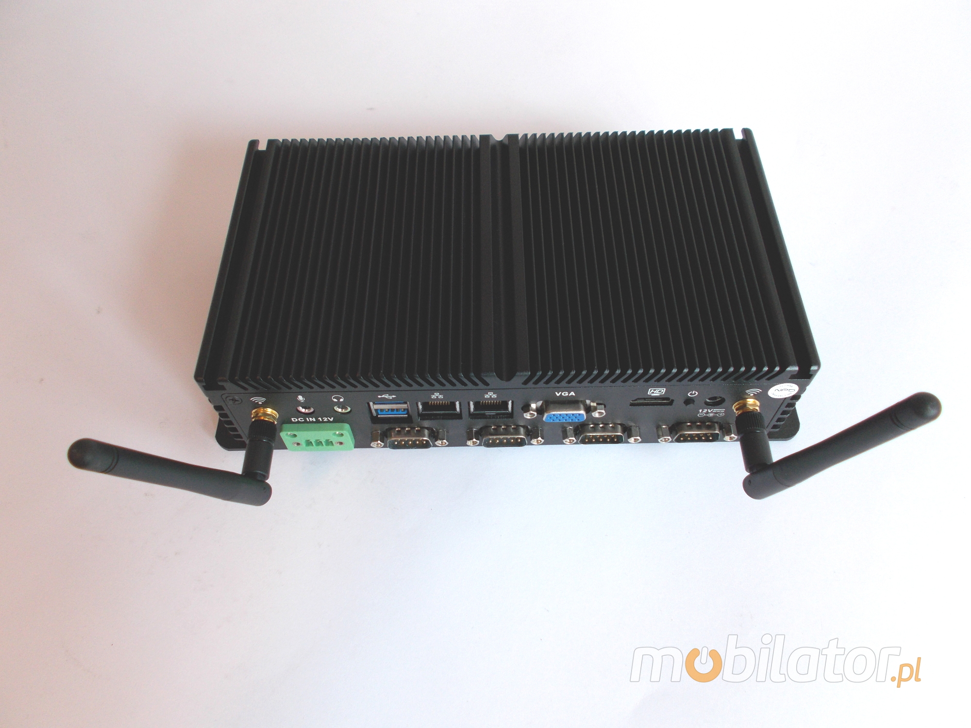 Integrated cards - Intel WGI211AT 1000M Lan and WiFi module allows connection to the network. The computer is equipped with: two LAN ports,  one VGA port, six COM ports, one HDMI port, one GPIO interface one USB 3.0 ports, five USB 2.0 ports, SIM Card slot and a built-in connector on the motherboard: two SATA  ports, one MiniSATA port, and two Mini-PCIE connectors.