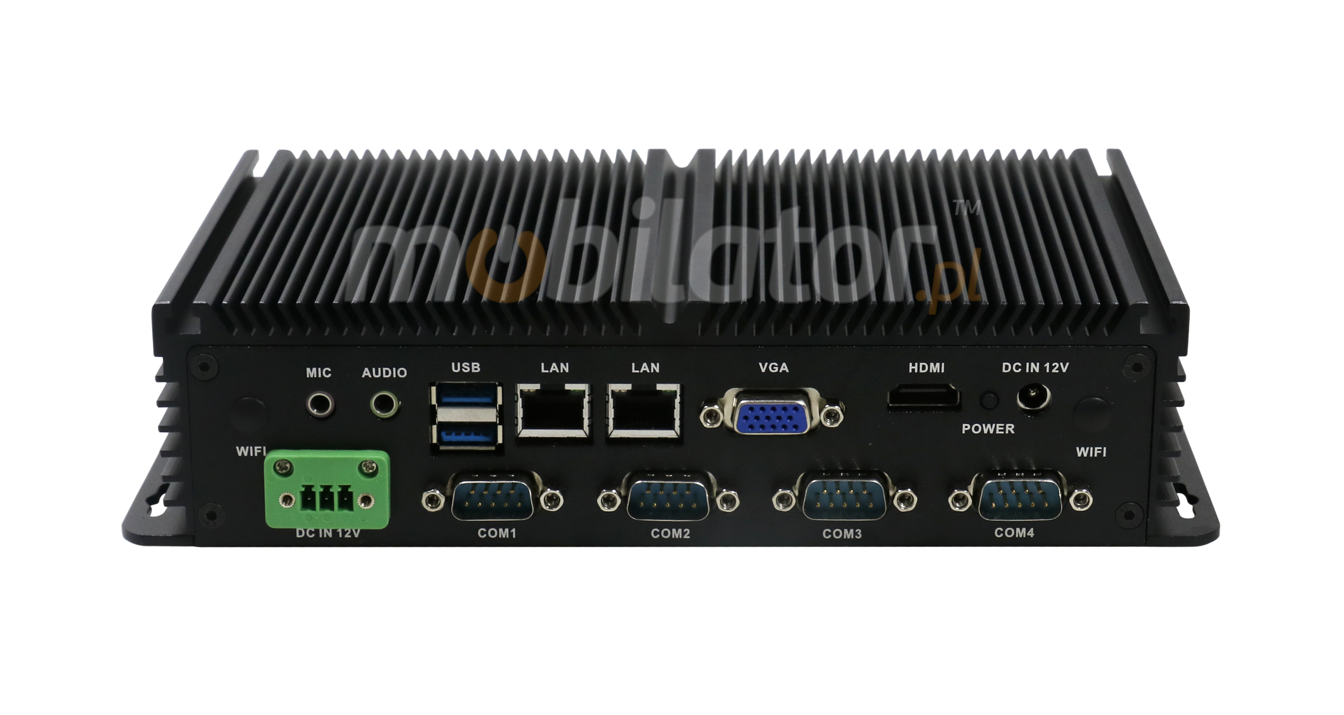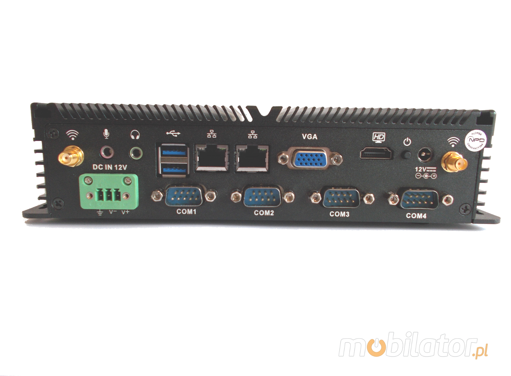 Integrated cards - Intel WGI211AT 1000M Lan and WiFi module allows connection to the network. The computer is equipped with: two LAN ports, one VGA port, six COM ports, one HDMI port, one GPIO interface oneUSB 3.0 ports, five USB 2.0ports, SIM Card slot and abuilt-inconnectoron the motherboard: two SATA ports, one MiniSATA port, and two Mini-PCIE connectors.