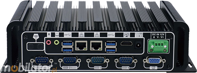 Integrated card - Intel i211AT 1000M Lan and WiFi+Bluetooth module allow connection to the network. The computer is equipped with: two LAN ports, two HDMI ports, four USB 2.0 ports, four USB 3.0 ports, six COM (RS232) ports, one VGA output, one Audio input and one Mic output.