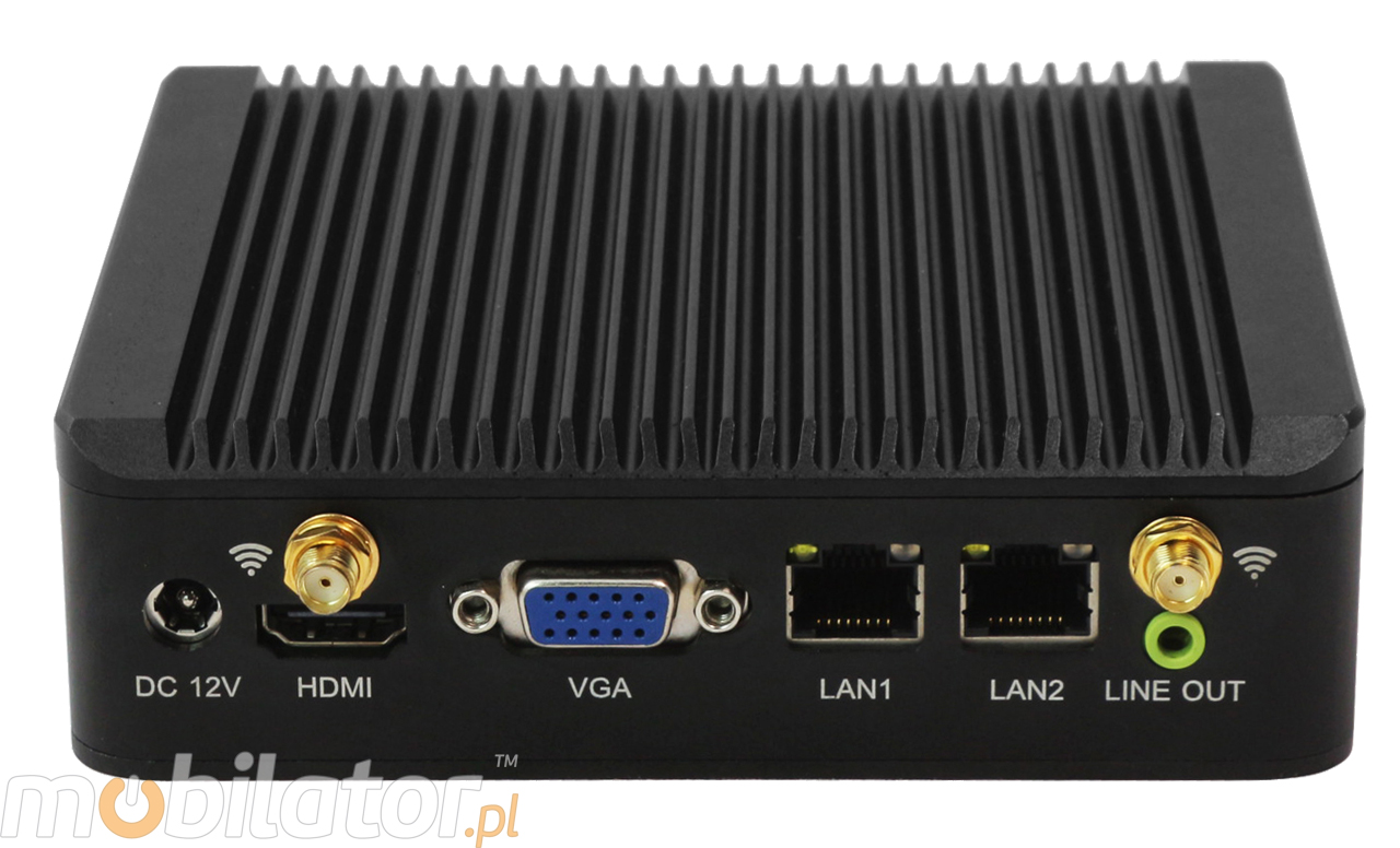 The industrial fanless MiniPC IBOX-Nano-J1900 uses a special method of cooling. This cooling takes place mainly by means of housing having a very large surface (longitudinal lamells, ribs) - for heat dissipation. Fan used inside the computer is designed to rapidly drain hot air from the CPU, allowing MiniPC to reach more efficiently and faster cooling.