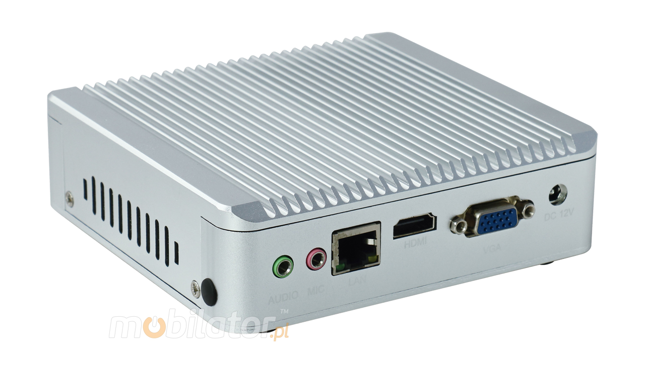 The industrial fanless MiniPC IBOX-Nano-J1900 uses a special method of cooling. This cooling takes place mainly by means of housing having a very large surface (longitudinal lamells, ribs) - for heat dissipation. Fan used inside the computer is designed to rapidly drain hot air from the CPU, allowing MiniPC to reach more efficiently and faster cooling.