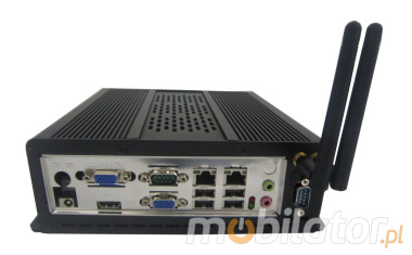 Integrated card - Intel RTL8105E 100M (optional WiFi module) allow connection to the network. The computer is equipped with: two LAN ports, ten COM ports (RS232), six USB 2.0 ports, one HDMI input, two VGA inputs, one way audio, one microphone input and connectors built into the motherboard: four USB 2.0 ports, two PowerOUT outputs, one audio output, one CPUFAN, one JVGA connector, one LVDS connector.