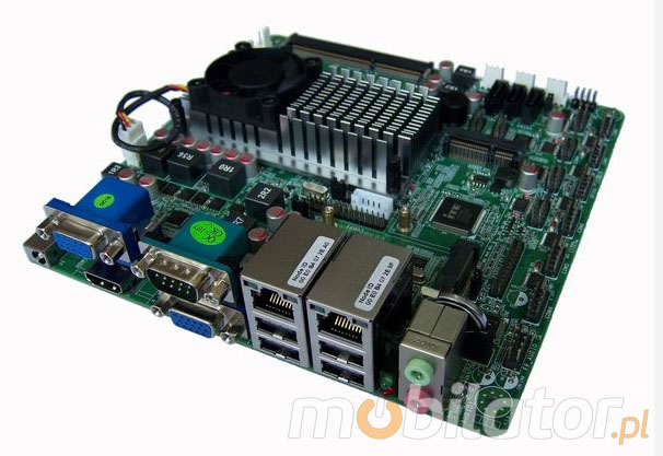 Integrated card - Intel RTL8105E 100M (optional WiFi module) allow connection to the network. The computer is equipped with: two LAN ports, ten COM ports (RS232), six USB 2.0 ports, one HDMI input, two VGA inputs, one way audio, one microphone input and connectors built into the motherboard: four USB 2.0 ports, two PowerOUT outputs, one audio output, one CPUFAN, one JVGA connector, one LVDS connector.