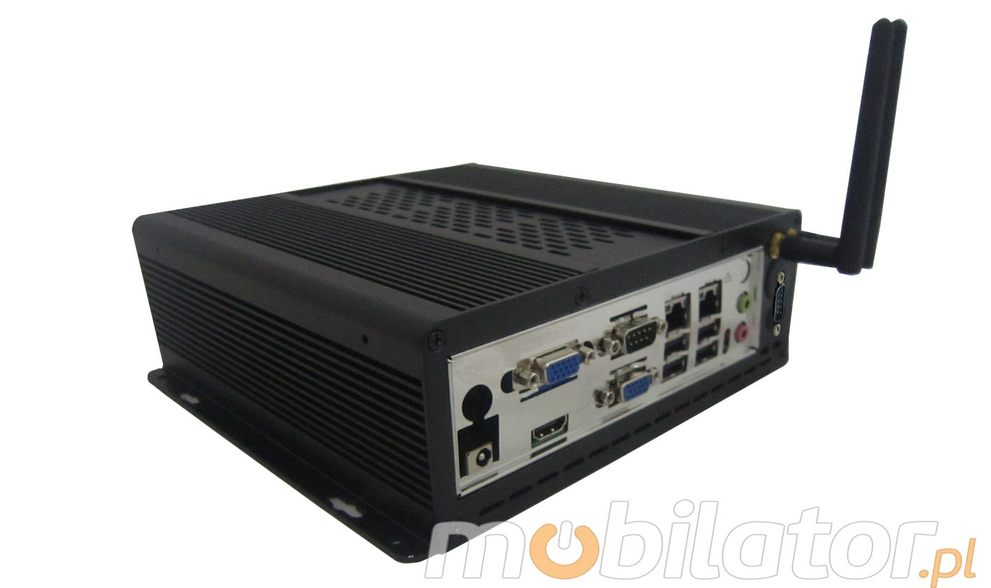 Integrated card - Intel RTL8105E 100M (optional WiFi module) allow connection to the network. The computer is equipped with: two LAN ports, ten COM ports (RS232), six USB 2.0 ports, one HDMI input, two VGA inputs, one way audio, one microphone input and connectors built into the motherboard: four USB 2.0 ports, two PowerOUT outputs, one audio output, one CPUFAN, one JVGA connector, one LVDS connector.