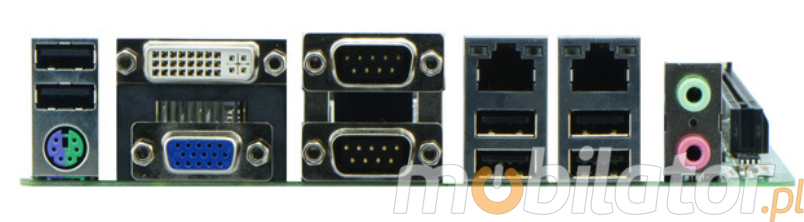 Integrated card - Intel RTL8105E 100M (optional WiFi module) allow connection to the network. The computer is equipped with: two LAN ports, six COM ports (RS232), eight USB 2.0 ports, one DVI input, one VGA input, one way audio, one microphone input and connectors built into the motherboard: four USB 2.0 ports, two PowerOUT outputs, one audio output, one CPUFAN, one JVGA connector, one LVDS connector.