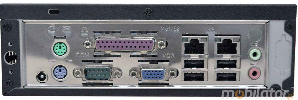 Integrated card - Intel RTL8111DL 100M and WiFi module allow connection to the network. The computer is equipped with: two LAN ports, four USB 2.0 ports, two PS/2 ports, one LPT input, one VGA output, one COM(RS232) conector, one way audio and one microphone input.