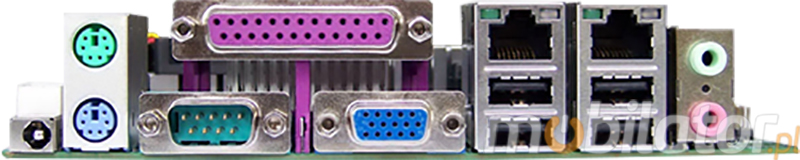 Integrated card - Intel RTL8111DL 100M and WiFi module allow connection to the network. The computer is equipped with: two LAN ports, four USB 2.0 ports, two PS/2 ports, one LPT input, one VGA output, one COM(RS232) conector, one way audio and one microphone input.