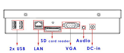 Integrated Network card 10 / 100Mpbs 1xRJ-45 LAN, WIFI allows you to connect the device to the network. The panel is equipped with: one LAN connector, one VGA, two USB 2.0 ports, one Audio(Eerjack) input , SD card slot and power connector (DC-in).