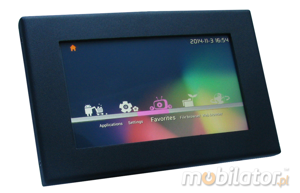 Using the latest technology Panel PC is designed for continuous operation multitasking with low power consumption. An important advantage is the powerful combination of small size with considerable opportunities through the use of processor family ARM® Cortex-A7 A20, 1GB of RAM memory. Integrated Mali400mp2 GPU video systems allow you to play a wide range of applications and media files (video, audio). The internal memory offers available to 8GB which can be expanded card SD memory (32GB max).