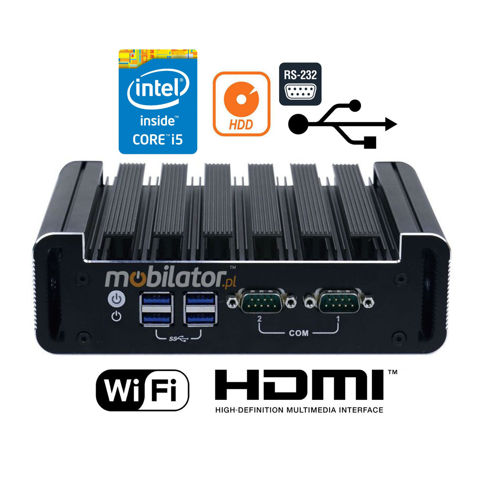 Small dimensions industrial computers excel in environments where dust, dirt and moisture predominate. They are ideal for applications requiring quiet operation. Small and reliable MiniPC use heat-pipe technology and aluminum fins for passive cooling. The robust mini industrial computer IBOX-180 Plus is a device designed for all industrial and non-continuous applications requiring continuous operation - 24 hours, 7 days a week.