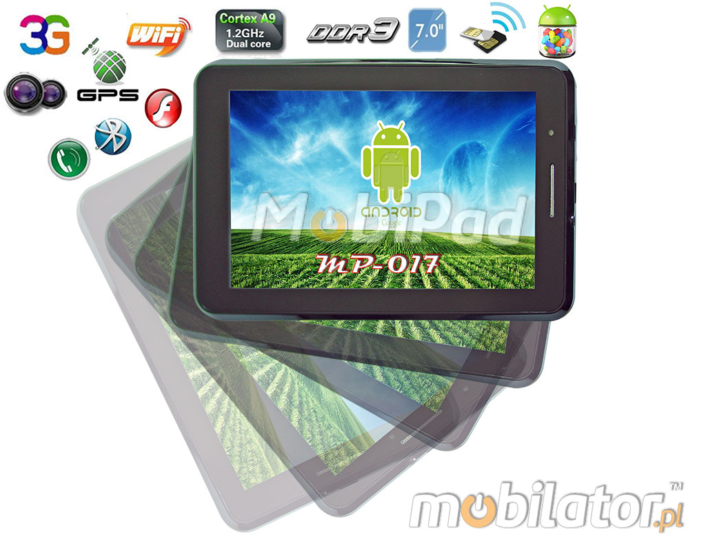New Tablet MobiPad MP-017 is equipped with a highly efficient processor MTK 8377 Cortex A9 1.2 GHz (dual core), which provides a comfortable and smooth operation. The device has a 7-inch capacitive touch screen with high resolution of 1024x600 pixels. By using such a high resolution on a small screen image displayed by the device really knocks quality. A very important feature of the new tablet MobiPad is the double slot Dual SIM card. Supervised the work of the latest operating system Android 4.1 JELLY BEAN.