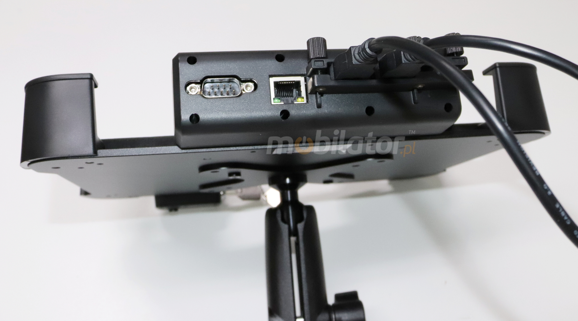 It is possible to use four different inputs/outputs in this holder: 1x RS232, 1x RJ-45 and 2x USB 2.0 which are working after plugging DC.