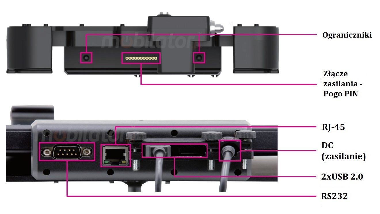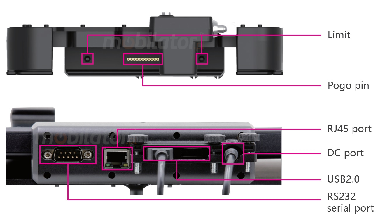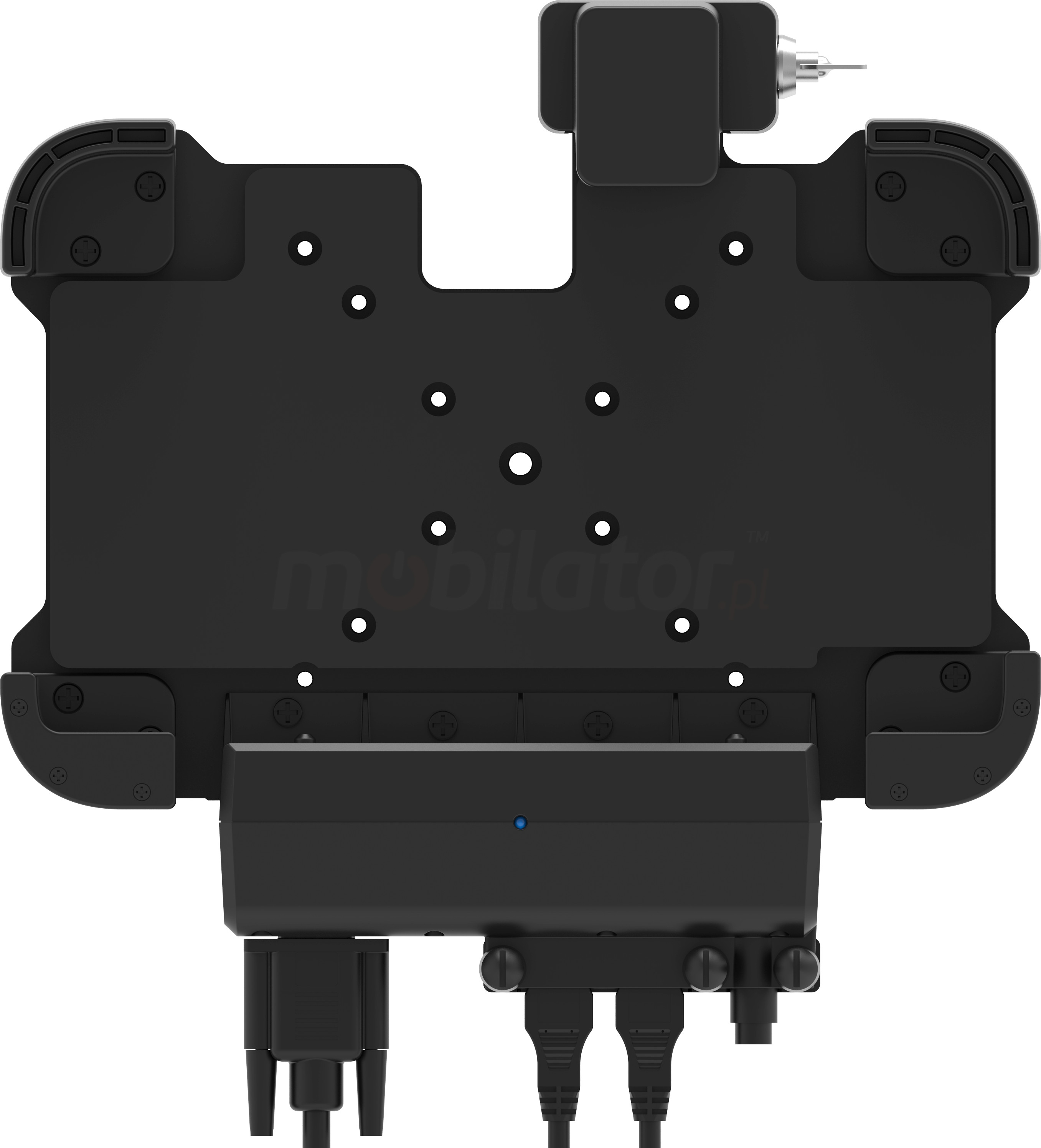 It is possible to use four different inputs/outputs in this holder: 1x RS232, 1x RJ-45 and 2x USB 2.0 which are working after plugging DC.